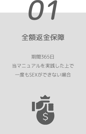 購入後、マニュアル通りに実践しても365日以内にセックスができなかった場合は、全額返金いたします。(※明らかにノウハウ通りに実践していない場合や、アドバイス内容を実践していない場合、修正点を改善していない場合など、当社基準で判断される場合は、返金対象外となります。)